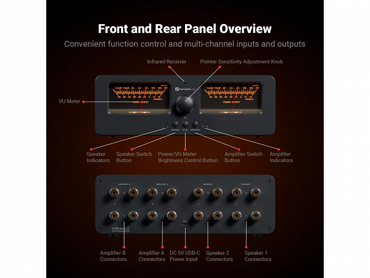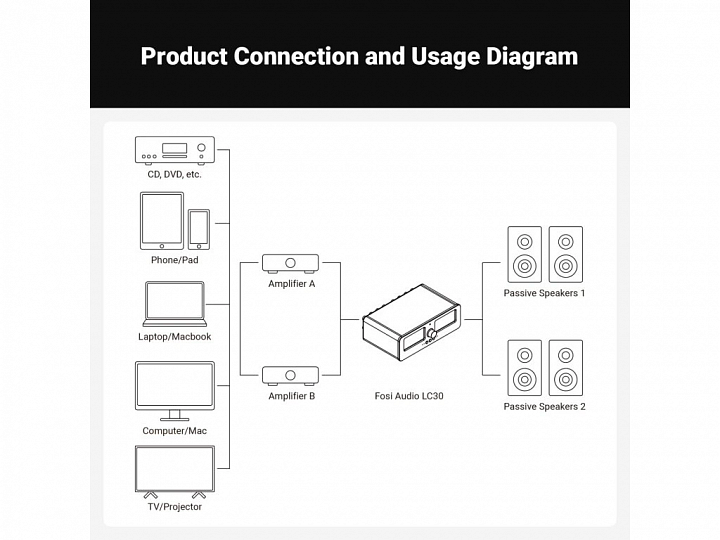 Fosi Audio LC30 je robustní přepínač navržený pro bezpečné propojení více zesilovačů a reprosoustav v jednom systému. Umožňuje snadno přepínat mezi dvěma zesilovači a dvěma páry reproduktorů bez nutnosti neustále odpojovat kabely. Je ideální pro uživatele, kteří střídají audio zařízení, testují komponenty nebo provozují více poslechových konfigurací.