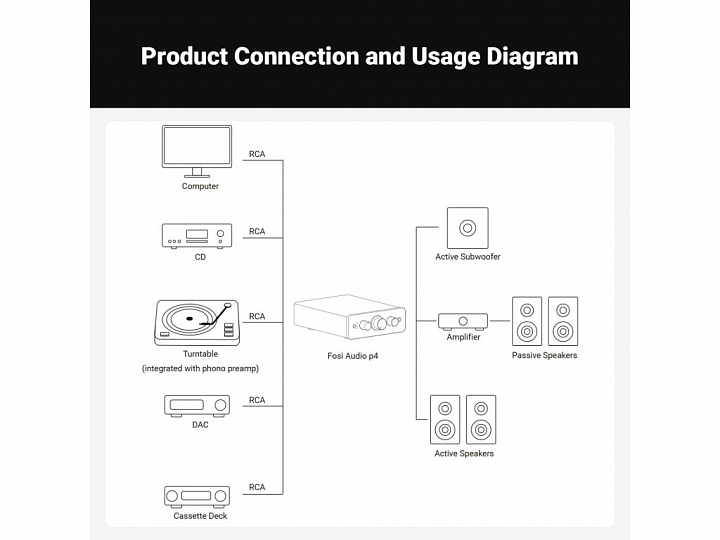 Fosi Audio P4 je praktický a univerzální stereo předzesilovač navržený pro uživatele, kteří chtějí propojit více analogových zdrojů, pohodlně je ovládat a jemně doladit zvuk. Díky jednoduchému rozhraní a kvalitní konstrukci se P4 hodí pro desktopové sestavy, menší HiFi systémy i koncové zesilovače.