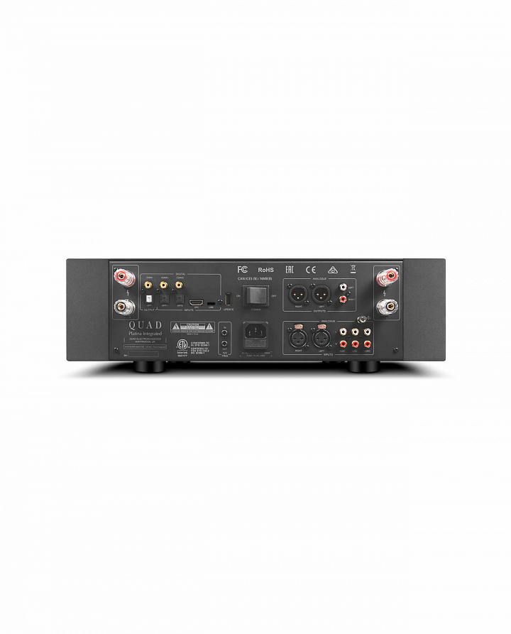 Kromě prémiových reproduktorových terminálů nabízí QUAD PLATINA INTEGRATED také symetrické výstupy XLR a RCA, které zachovávají flexibilitu integrace do širších audiofilních systémů pro použití se subwoofery nebo dokonce výkonnějšími zesilovači, aniž by byla ohrožena funkčnost.
